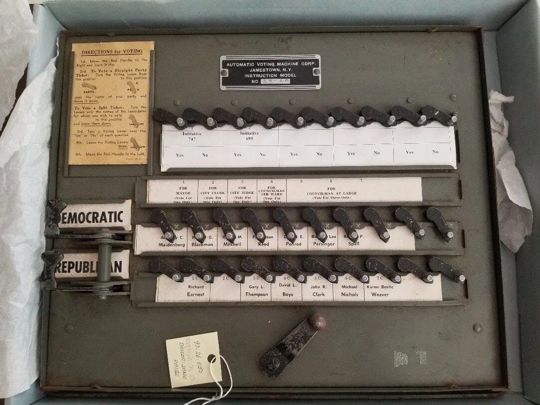 For the greater part of the 20th century the most common way to cast and count votes was through the use of bulky, half-ton mechanical behemoths known as lever voting machines.