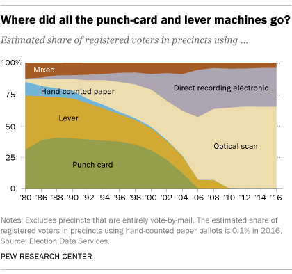 The transition to all-electronic voting was supercharged, however, by the passage of the Help America Vote Act,26 which was signed into law on October 26th, 2002. Drafted in response to those voting failures and the resultant crisis of confidence in the administration of democracy, most important of its provisions was the order to phase out mechanical voting systems, and the disbursement of federal funds to jurisdictions across the country to replace these systems with advanced electronic voting machines or optical scanning systems, which were promised to make voting easier, faster, more reliable, and preclude the administrative debacles of the past. Beforehand, electronic voting systems were used by no more than 40% of registered voters in the country — including punch card counties, 55%. Afterwards, that quickly expanded to >99% by the top of the decade.