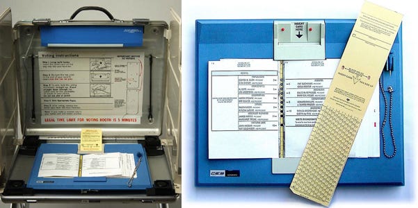 The Votomatic was a mechanical ballot marking device that translated voter intent into a vote on a physical, pre-scored punched card, containing a dense layout of voting positions accommodating complex ballots. The punch cards are not verifiable by voters for a lack of candidate nominal signage next to each hole, so it is impossible for a voter to know, unless if they have access to ballot design files for that jurisdictions, if their votes were punched properly. The other popular configuration is the Datavote card punching machine, which is combined with punch cards that do have such signage, though at greater cost to the jurisdiction.6
